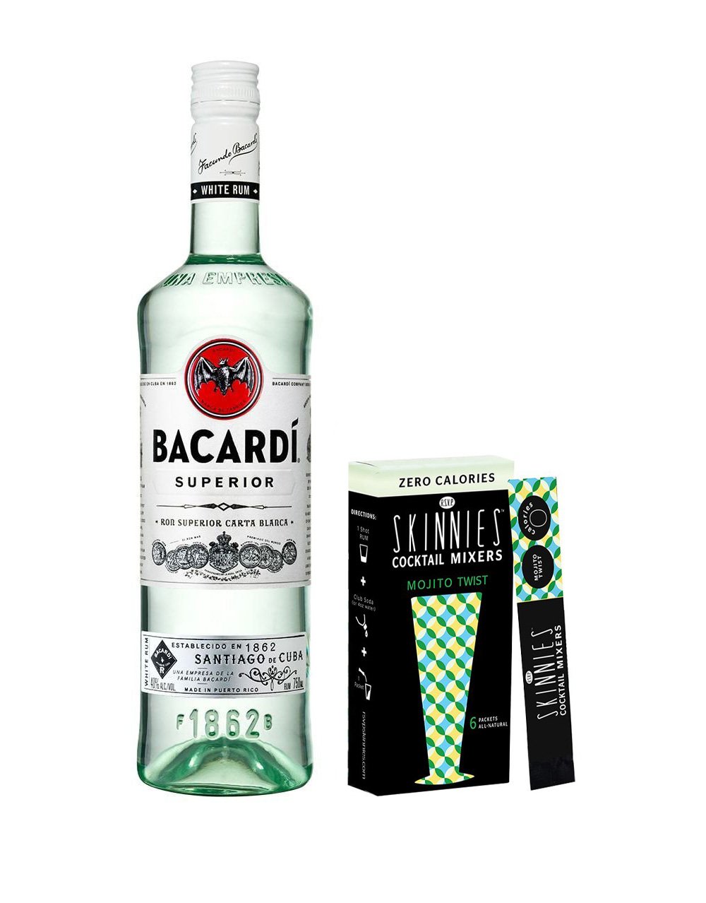 Includes: one (750ml) bottle of Bacardí Superior and two boxes (6 mixers per box) of Skinnies Mojito Twist