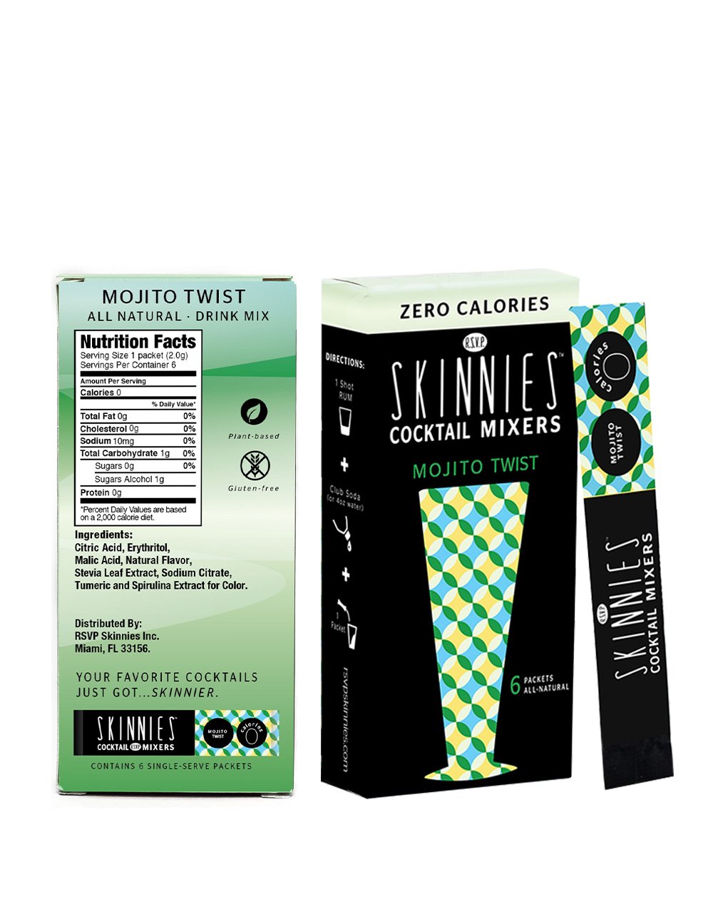 Skinnies are zero calorie mixers, made from fruit & plant based ingredients, minus the sugar, plus a hint of stevia. With Skinnies, you save calories vs traditional mixers. To make a Zero sugar Mojito just add 1 Skinnies packet + 1 part Rum + Club Soda (or 4oz water), garnish with a lime and enjoy.